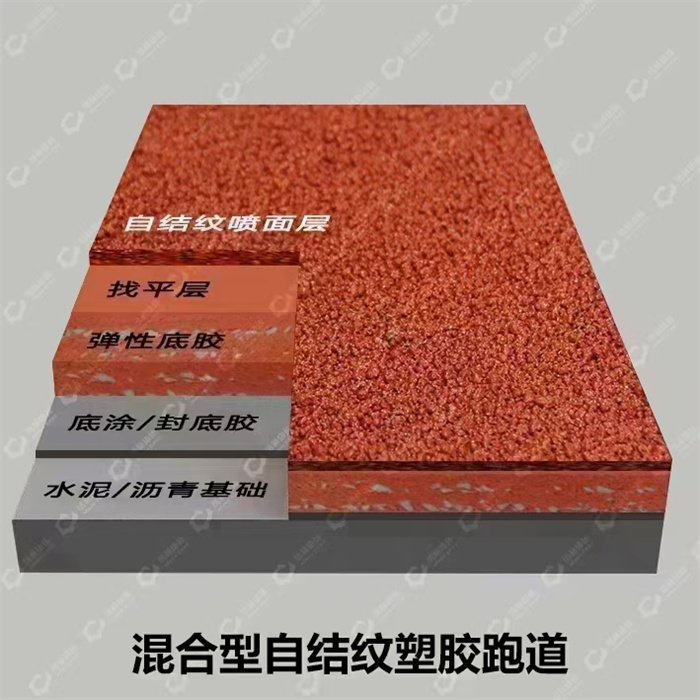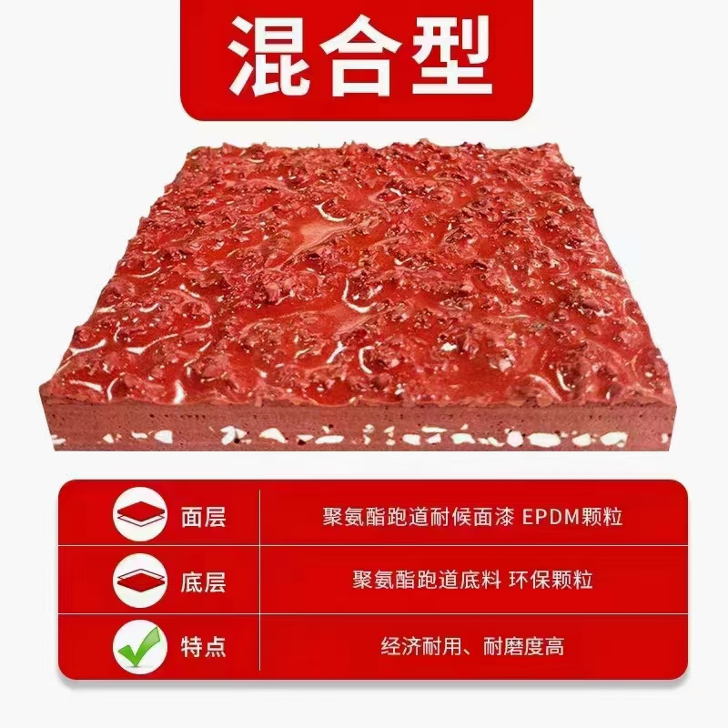 緩沖層由EPDM顆粒與雙組份聚氨酯彈性體A、B組混合澆筑而成。 面層由雙組份聚氨酯彈性體A、B組混合與EPDM顆粒混合后噴涂而成。