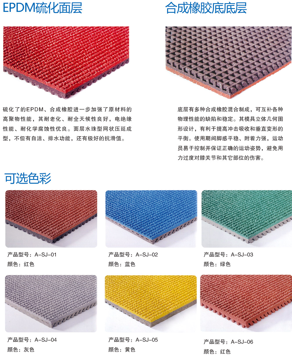 高校、體育場(chǎng)、訓練場(chǎng)、專(zhuān)業(yè)賽事用跑道。 總厚度:≥13mm